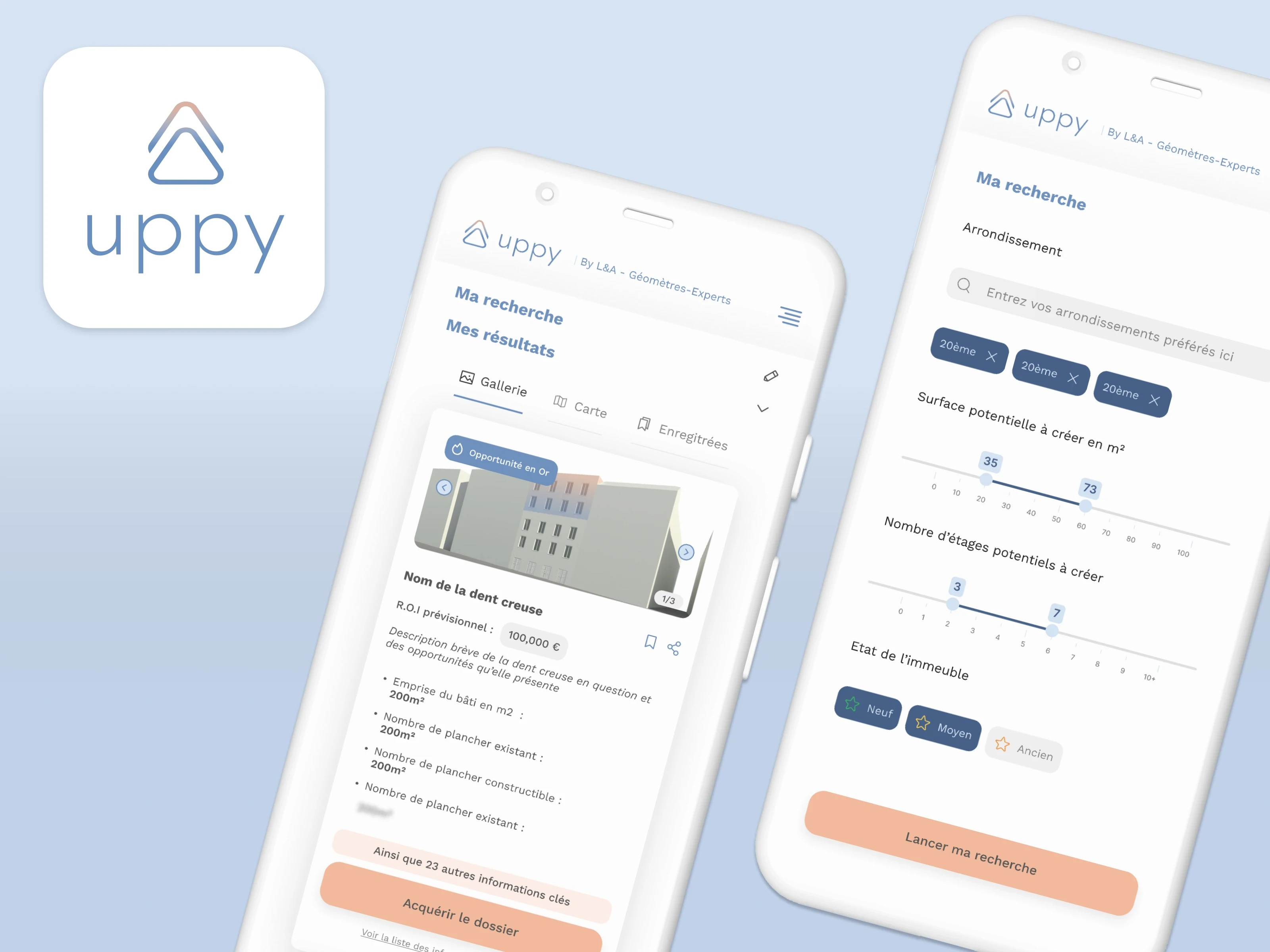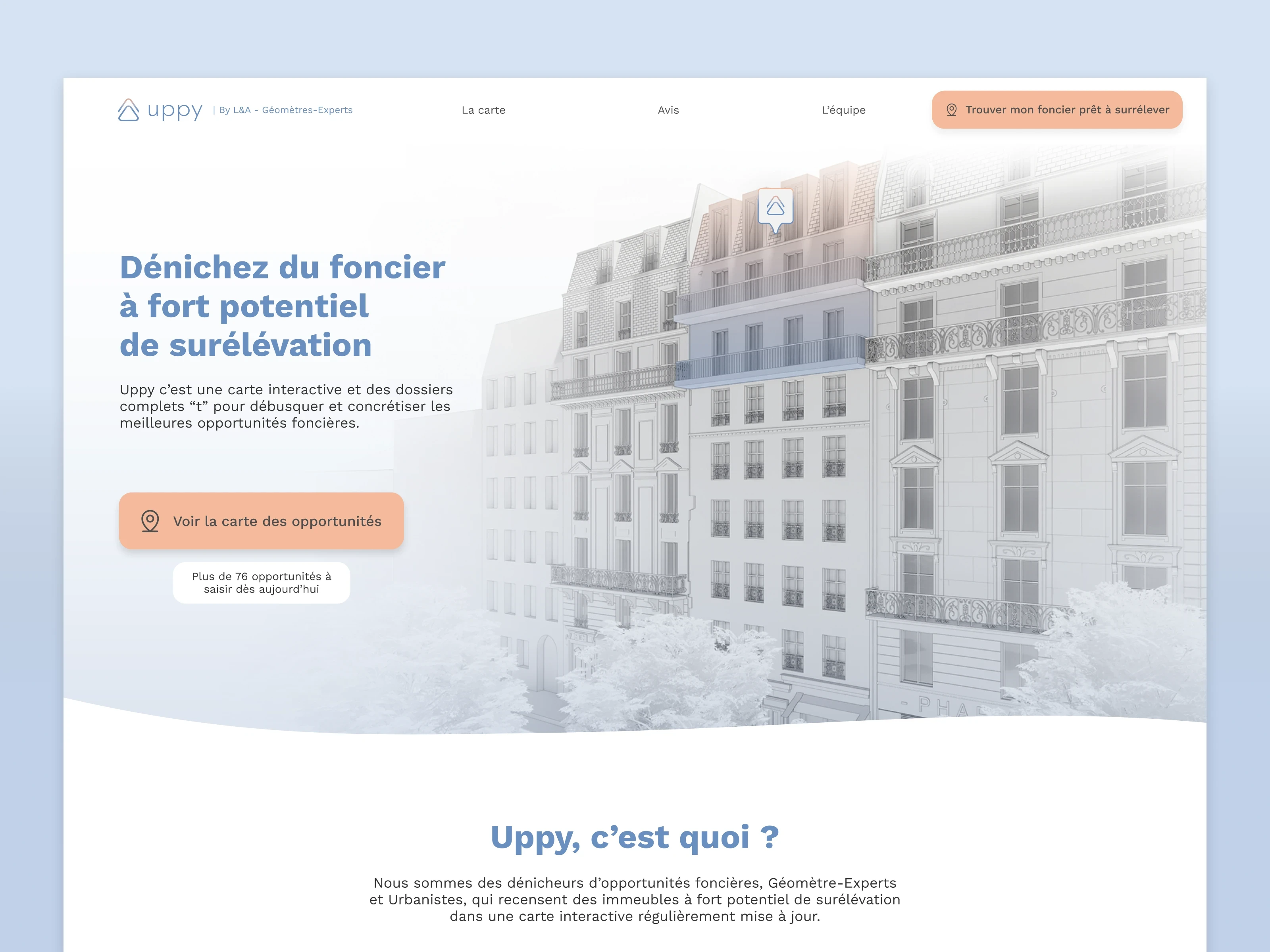 Uppy's core product is an interactive map showcasing building raise opportunities across Paris. Upon finding a suitable opportunity, users gain access to crucial documentation tailored to their specific location. This project encompassed the creation of brand identity from scratch, UX/UI design, copywriting, and handoff to development with quality assurance.